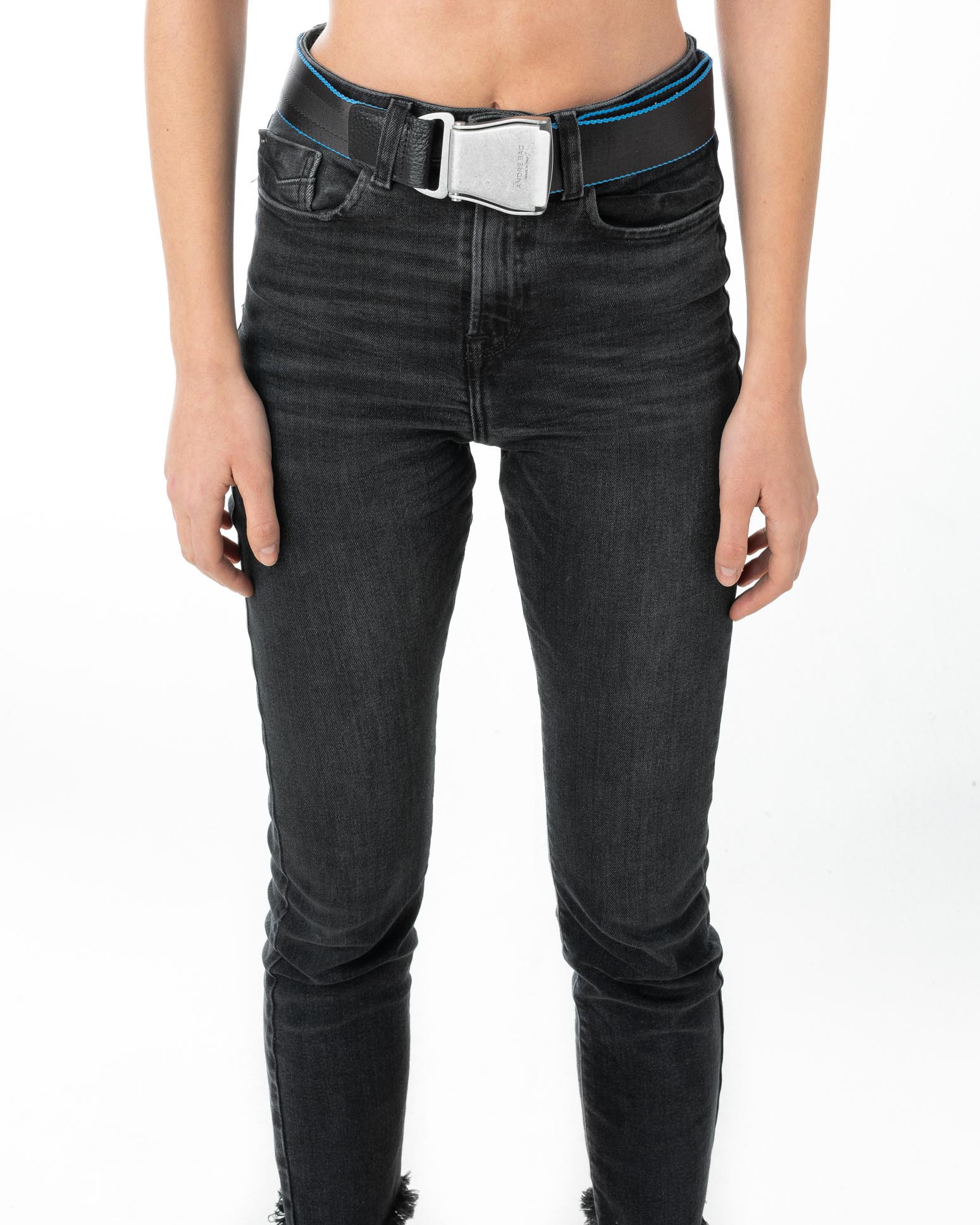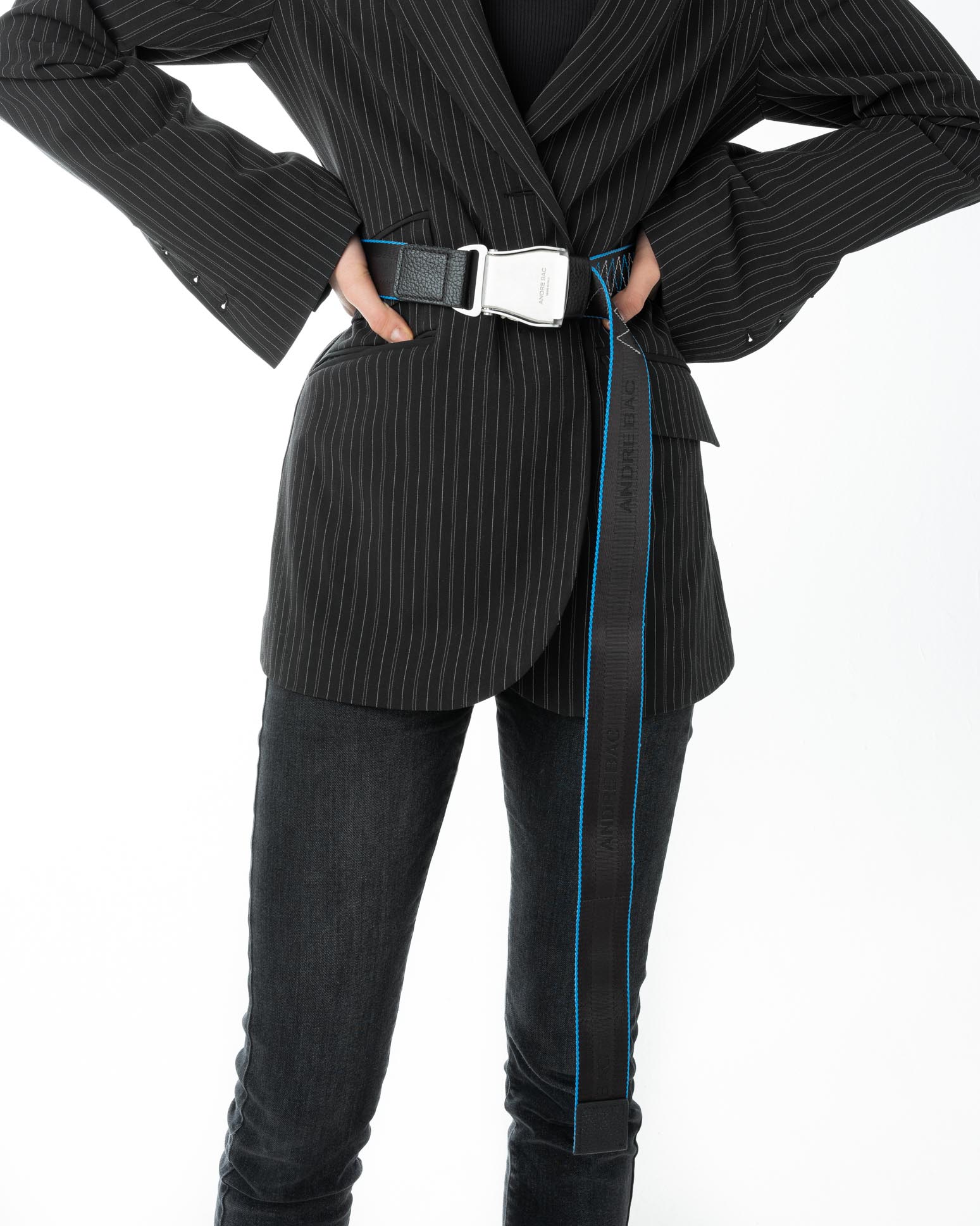 Aviation inspired belt, made from custom jacquard fabric with logo and blue edges. Featuring the AB flight buckle crafted from brass with an industrial silver finishing. Comes with a printed PU leather tag and grain leather trims as well as a large two-tone zigzag stitching crafted by hand.